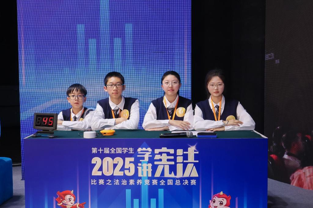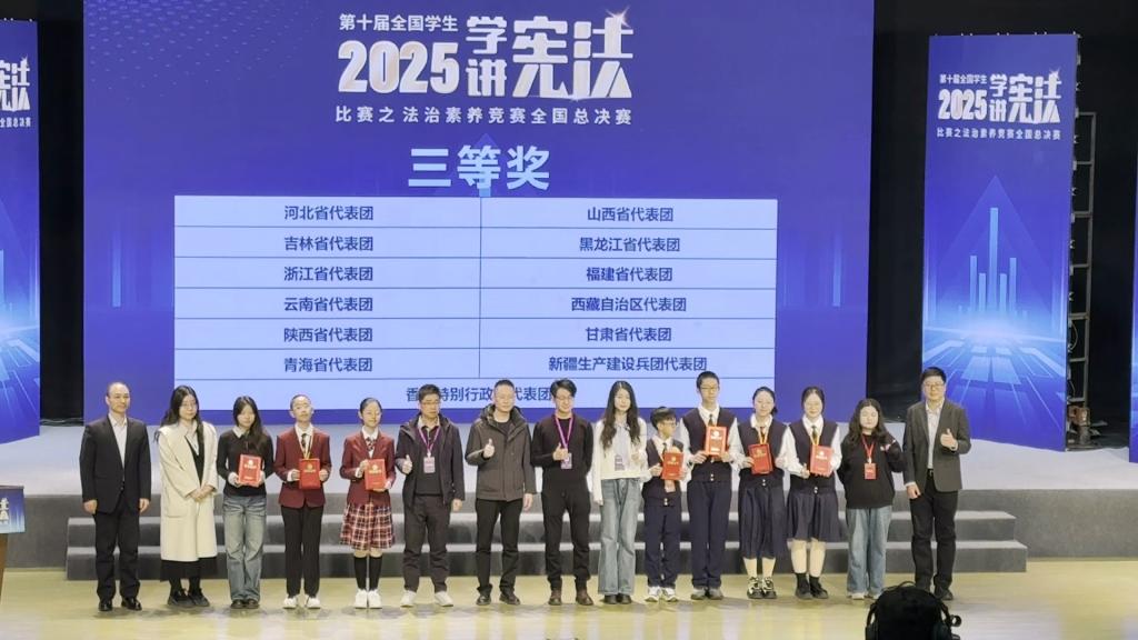 在全国总决赛的舞台上,我校代表队的小成员们沉着应战,全力以赴,在各自组别的竞争中,用清晰的观点、流畅的表达和扎实的法治知识功底,讲述了他们心中的宪法故事与法治中国故事,赢得了评委与观众的认可,最终喜获全国三等奖,为我省青少年学生赢得了荣誉。