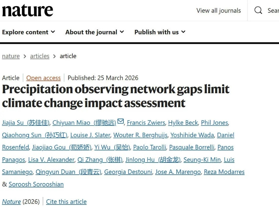 近日,由北京师范大学地理科学学部和我校地理科学学院开展的深度合作研究取得重要进展。由北京师范大学缪驰远教授牵头,双方联合进行的研究成果以《Precipitation Observing Network Gaps Limit Climate Change Impact Assessment》为题,成功发表在国际顶级学术期刊《Nature》2026年第3期,我校地理科学学院青年教师张棋博士深度参与了此项研究。
