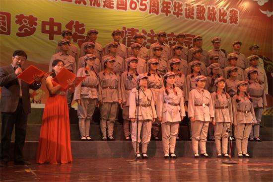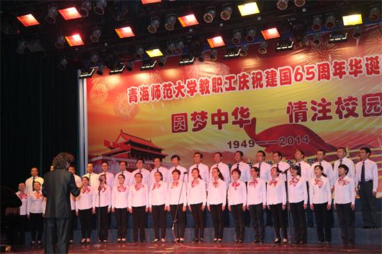 65年艰苦创业志在国富民强,65载栉风沐雨共谋伟大复兴。在举国上下共庆建国65周年之际,9月28日晚,学校隆重举行“梦圆中华·情注校园”庆祝建国65周年教职工合唱比赛。来自全校31个工会分会的近千名教师共同欢唱、倾情放歌,共庆伟大祖国65华诞,共祝伟大祖国更加繁荣昌盛、共愿实现民族伟大复兴中国梦早日梦圆中华。校党委书记张银生、校长何波、副校长扎布、王锋、赵海兴出席了合唱会并与老师们一起登台演出,联袂献上了全校教师对伟大祖国的深情祝福。15名来自学校各院系、部门的教师代表担任了比赛评委。
