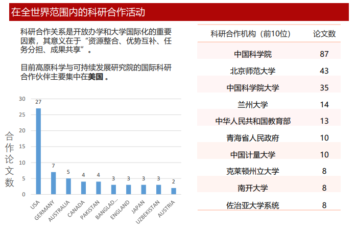 高科院建院近3年来,已与35所高校、科研院所和政府机构建立战略合作关系。建成高层次科研团队52支,引进省外高层次人才237人,吸引省内外科研人员416人。高科院各科研团队及科研人员立足青海省,依托青藏高原区位优势,聚焦高原教育、高原历史与文化、高原资源与环境、高原生物、高原健康、高原防灾减灾、高原大气水文、高原经济等八大研究领域,全面开展中国及国际高原科学前沿研究。截至7月,发表SCI论文101篇、EI论文18篇、CSCD论文99篇、CSSCI论文100篇、北大核心24篇、其他公开刊物96篇,共438篇学术论文。同时,与合作团队获批及在研课题共122项,获批及申报专利32项,出版学术著作41部。