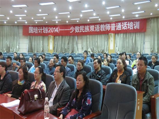 为切实提高我省少数民族双语教师的普通话水平,促进教师的专业化发展,受教育厅委托,“国培计划(2014)——少数民族双语教师普通话培训班”于9月14日在我校正式开班。省教育厅师范教育处副处长张宏山、校党委副书记马德明、学校相关部门负责人及担任此次培训授课任务的国家(省)级测试员和全体学员参加了开班典礼。学生工作处董海峰处长主持了开班典礼。