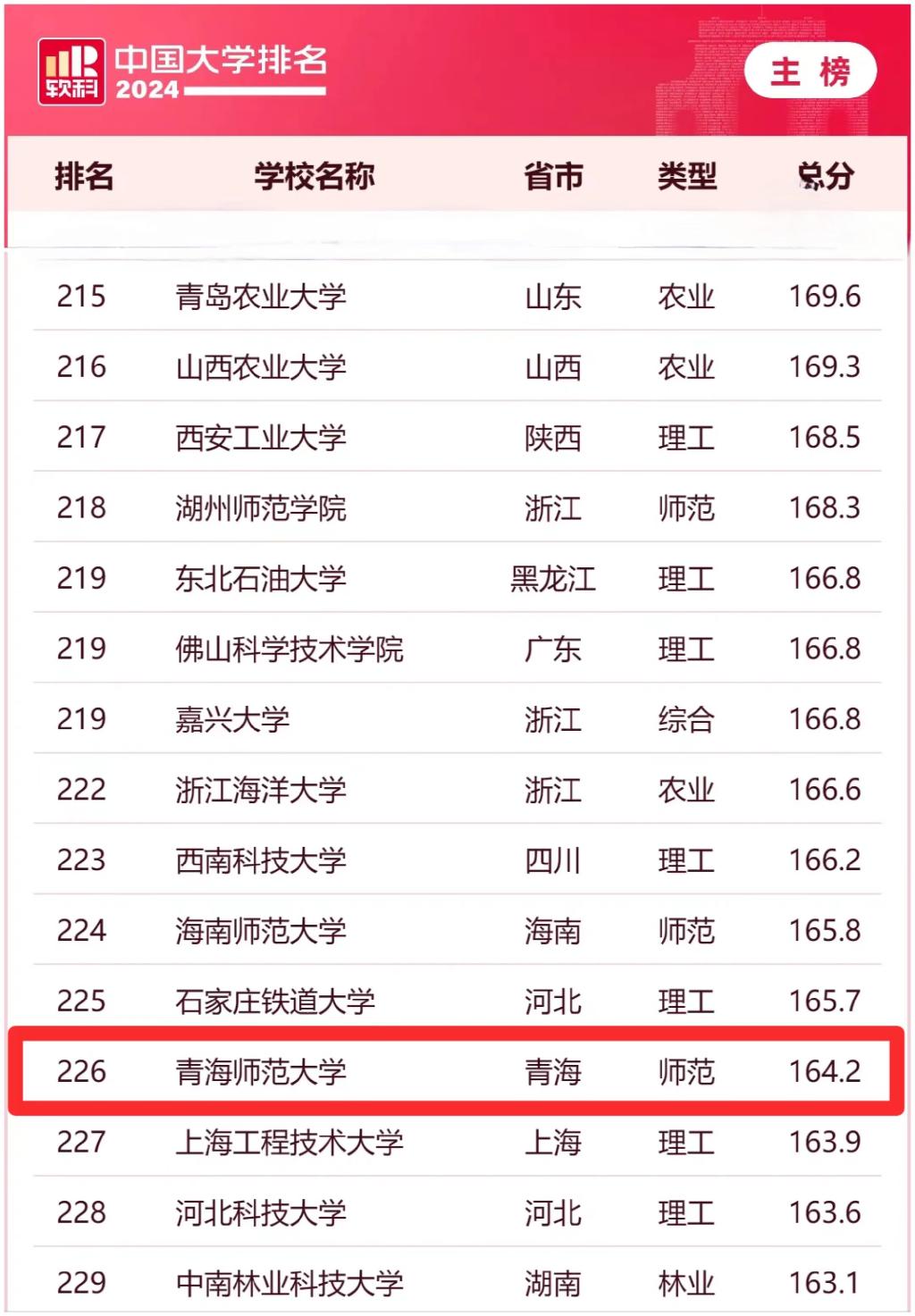 4月18日,高等教育专业评价机构软科正式发布“2024软科中国大学排名”。青海师范大学较2023年晋升28位,综合排名居于全国第226位。