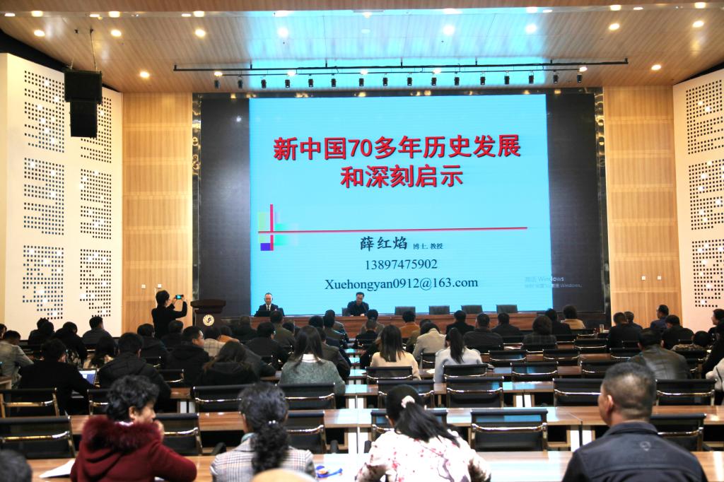 薛红焰教授围绕新中国70多年历史发展和深刻启示为主题,回顾了在党的领导下新中国走过的辉煌历程,通过详实的史料、生动的细节展现了新中国成立以来几代领导人从中国实际出发探索具有中国特色社会主义道路的坚定信念和奋斗精神。报告语言生动,事例鲜活,内容全面,解析透彻,为大家全面、深刻地理解新中国的光辉历程,进而提升坚定走中国特色社会主义道路的自信心和自豪感,有非常重要的帮助和启迪。