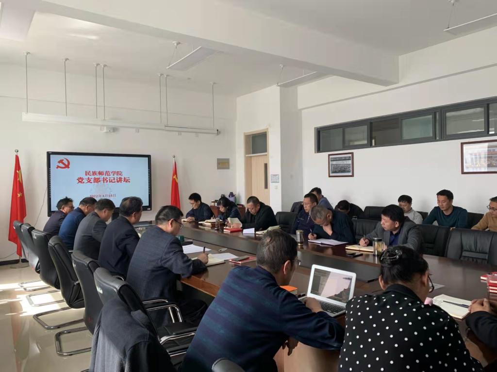 根据民族师范学院春季学期党建工作月历安排,3月份集中开展“党支部书记讲坛”活动。14日下午,首次“党支部书记讲坛”由院机关党支部书记刘云峰以《赶考路上,跳出历史周期律--从“窑洞对”到党的自我革命》为题作分享交流。院党委书记吉太加、院长陈永良以及党委委员、各部门负责人、党支部书记共23人参加了活动。活动由院党委副书记王荣主持。