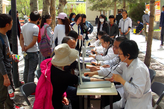 为增强师生的保健意识和卫生健康疾病防控意识,校医院以切实为患者提供安全、方便、满意的医疗服务为出发点,在北校区林荫道开展了“便民义诊”活动,现场为师生免费诊疗、量血压、测体重、发放健康知识宣传册以及健康咨询等义务服务,吸引了众多的师生。活动当天,为师生提供量血压服务100余人次,测体重200余人次,发放健康知识宣传资料300余份,取得了良好的活动效果,达到了预期的目的。