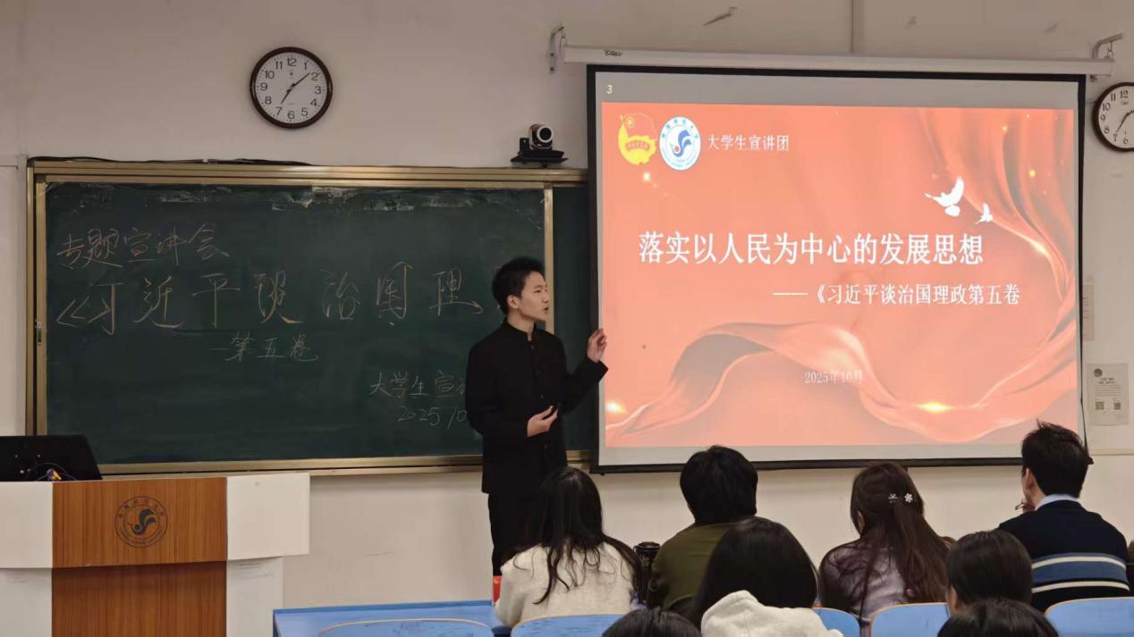 宣讲会上,宣讲团成员们以饱满的热情和生动的语言,从《习近平谈治国理政》第五卷中关于“以人民为中心”的重要论述出发,结合大学生的实际生活和学习场景,深入浅出地进行讲解。他们引用了书中的经典语句,如“人民对美好生活的向往,就是我们的奋斗目标”,并通过列举身边的实例,如学校在改善教学设施、提升学生服务等方面的举措,让同学们深刻感受到“坚持以人民为中心的发展思想”就在身边。宣讲团成员指出,作为新时代大学生,要将“坚持以人民为中心的发展思想”融入到专业学习中,努力提升自己的知识技能,为将来服务社会、造福人民打下坚实的基础。号召学院学生通过参与科技创新活动,研发出更多有利于改善人民生活的科技产品;积极参与志愿服务,用自己的实际行动为身边的人提供帮助和支持。