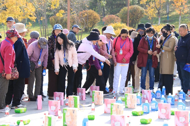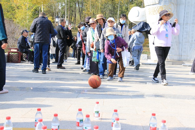 随后开启了热闹的趣味互动,套圈、保龄球、重阳节知识问答等小游戏依次开展,现场气氛热烈而融洽。退休教授王老师笑着说:“学校年年都想着我们,这活动安排得太贴心了!既能出来走走锻炼身体,又能和老同事们聚聚聊聊,心里比吃了蜜还甜!”