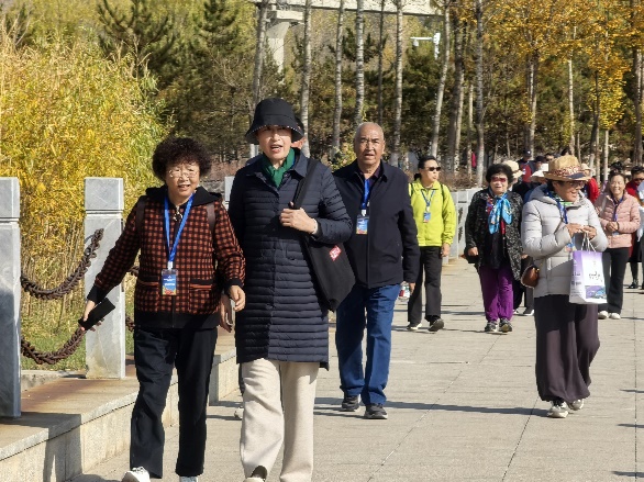 老同志们并肩漫步,畅谈往昔在校园里备课授课、培育学子的难忘点滴,或驻足观景,或对着绚烂秋景和身旁老友拍照留念。沿途设有补给点,志愿者们提前备好矿泉水、糕点和应急药,医疗保障人员全程随行。