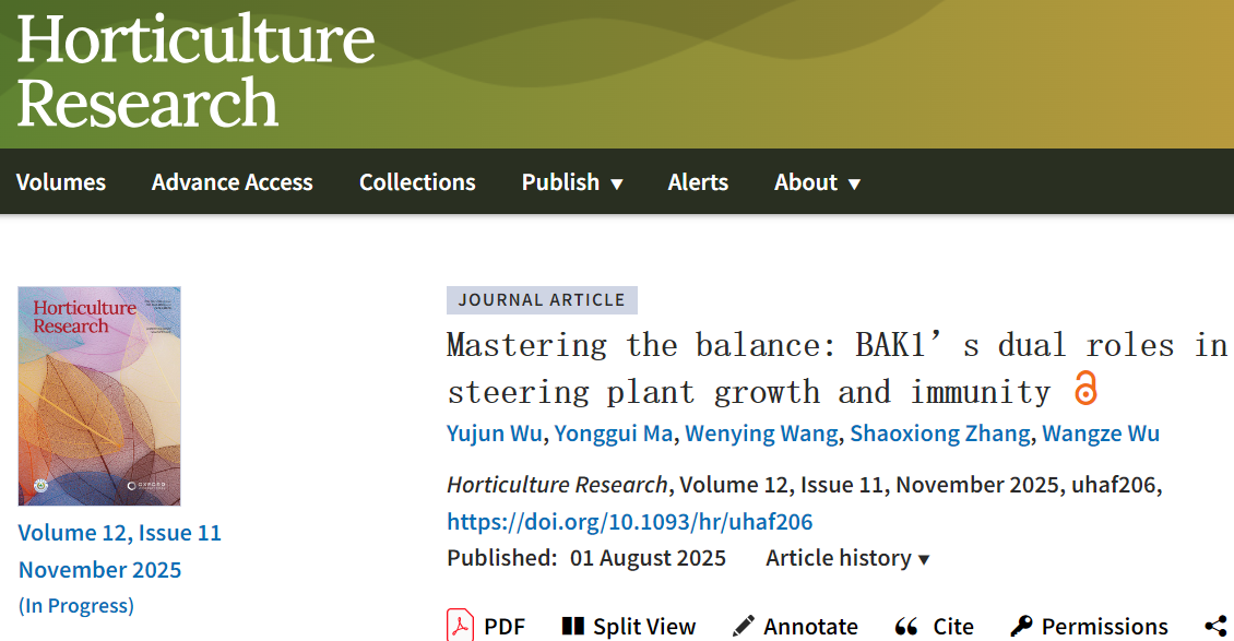 2025年11月,生命科学学院吴玉俊副教授团队首次在国际顶级期刊Horticulture Research(《园艺研究》)上发表了题为Mastering the Balance: BAK1’s Dual Roles in Steering Plant Growth and Immunity的论文。
