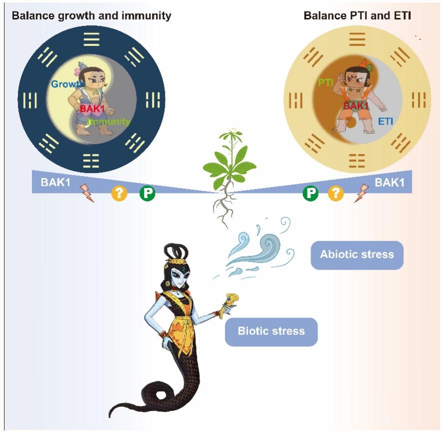 该论文结合国内外研究进展,在梳理BAK1功能研究历程的基础上,全面阐述了BAK1作为植物生长与免疫平衡调控的核心决策蛋白,通过与不同受体互作及自身活性、丰度的动态调控,在主导植物生长发育与免疫防御两大对立通路中的作用及生物学意义。随后,从BAK1独特的蛋白质空间结构特征、不同磷酸化位点对其功能偏向性的调控作用两个维度,进一步解析了BAK1协调植物生长与免疫的分子机制。同时,在植物先天性免疫调控层面,系统分析了BAK1在模式触发免疫(PTI)信号激活及PTI向效应子触发免疫(ETI)转化过程中的调控意义,进一步明确其作为“免疫开关”在PTI与ETI协同调控网络中的核心作用。最后,文章总结了当前BAK1功能研究领域的关键科学问题与研究空白,对未来核心研究方向进行了展望,并提出了基于BAK1与互作蛋白的复合物结构,结合人工智能技术开展靶向小分子生物农药开发,以及通过受体人工改造实现“高抗-高产”作物培育的潜在策略。