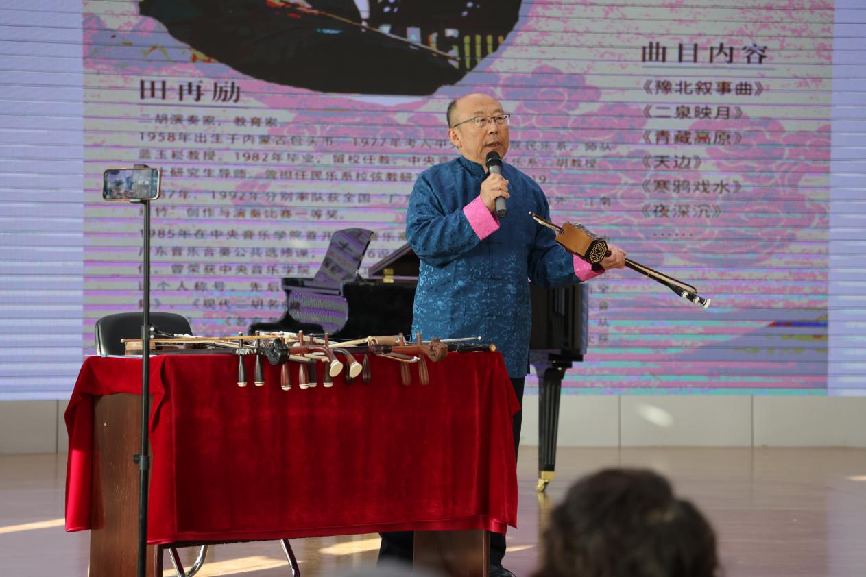 11月12日下午,中央音乐学院教授、我校银龄教师——著名二胡演奏家、教育家田再励,在音乐学院多功能厅举办《胡琴经典作品赏析》专题讲座。音乐学院师生与社会各界人士齐聚现场,共同感受胡琴艺术的独特魅力。