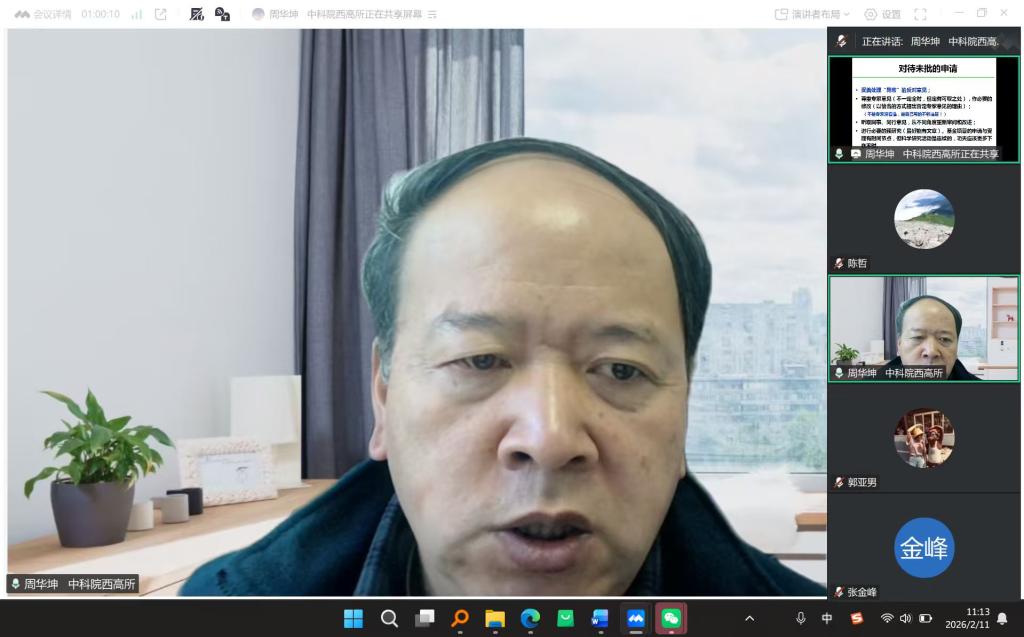 为持续推进2026年度国家自然科学基金申报工作,进一步提升项目申请书质量,生命科学学院于2月11日上午,线上举办第二次申报研讨会。会议特邀中国科学院西北高原生物研究所研究员周华坤担任主讲嘉宾。学院20余位教师积极参与,会议由副院长陈哲主持。