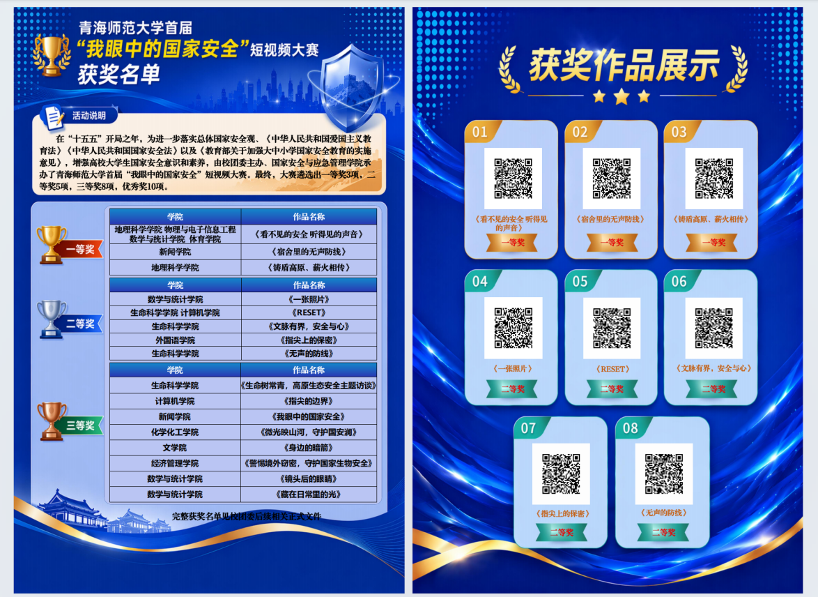 为创新国家安全教育形式,贴合青年学生特点,学院联合校团委面向全校举办首届“我眼中的国家安全”短视频大赛,吸引各学院学生积极参与,共征集作品40余项,评选出一、二、三等奖及优秀奖,优秀作品进行展播扩大宣传,有效实现“以赛促学、以学促行”,引导学生在创作与观赏中深化对国家安全的理解与担当。