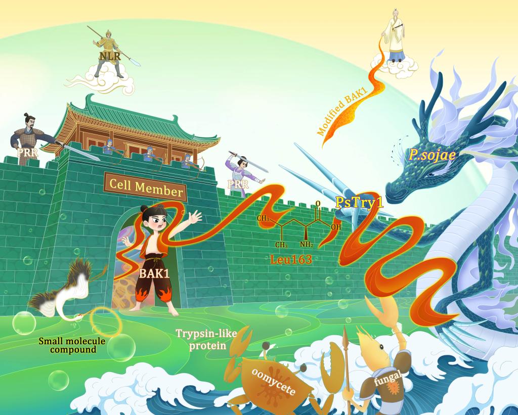 该研究通过系统分析大豆疫霉(Phytophthora sojae)分泌的质外体效应子蛋白,首次鉴定到一类能够在质外体空间直接靶向切割核心免疫共受体BAK1胞外结构域的胰蛋白酶样丝氨酸蛋白酶,PsTry1。在此基础上,研究团队通过精准的位点鉴定与功能筛选实验,进一步证实,PsTry1可特异性识别并切割大豆BAK1胞外富亮氨酸重复结构域中的Leu163位点。从BAK1蛋白结构与功能关联层面分析来看,该切割位点定位于BAK1第4个富亮氨酸重复序列(LRR4)的α-螺旋区域,而这一结构域恰好是BAK1完成配体识别并与PRRs组装形成免疫受体复合物的核心功能区。因此,质外体效应蛋白PsTry1对植物抗病免疫的抑制,是因为BAK1中Leu163位点被特异性切割后,会直接破坏BAK1免疫受体复合物的正常组装,进而阻断了植物病原相关分子模式触发的免疫(PTI)信号通路的正常激活与传导,最终导致植物对病原菌的基础抗病能力大幅降低。值得注意的是,PsTry1对免疫激活状态下的BAK1表现出更强的切割偏好,这可能也是因为免疫激活后,BAK1发生磷酸化诱导的构象变化,使得核心切割位点更充分暴露,从而更易被PsTry1识别与切割。此外,与传统的胞内效应蛋白由植物胞内NLR受体识别并触发免疫不同,PsTry1在质外体空间中发挥作用能有效规避胞内NLR免疫监视系统的识别,形成一种“隐蔽攻击”策略。因此,未来对PsTry1/BAK1复合体精细结构的解析,将一方面有助于深入阐明PsTry1的致病机制,并为抗病作物的分子设计育种提供潜在靶点。另一方面,也将有助于回答植物是否已进化出能够直接识别PsTry1并启动免疫应答的受体蛋白,或针对PsTry1这类质外体效应蛋白的蛋白酶抑制剂,以为将来绿色新型生物农药的开发奠定扎实的理论基础。
