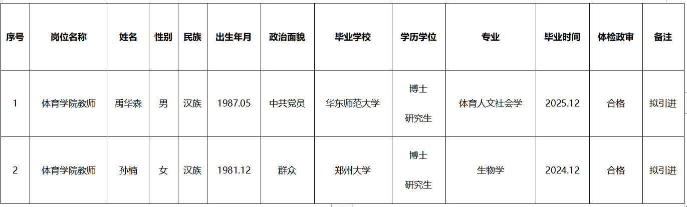 根据《青海省事业单位公开招聘工作人员办法》(青人社厅发〔2015〕80号)及《青海师范大学2026年公开招聘博士公告(第一批)》等相关政策规定,我校已完成拟引进博士禹华森、孙楠的考核、体检、考察政审等工作,现将相关信息进行公示,公示期为2026年4月10日至16日(共7天)。公示期间,如对拟引进人员有异议,请以来电或书面形式反映。反映情况时应署真实姓名和联系方式,匿名反映不予受理。