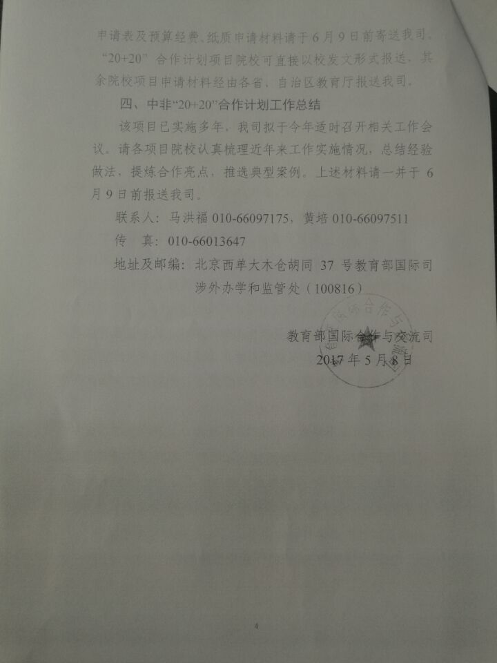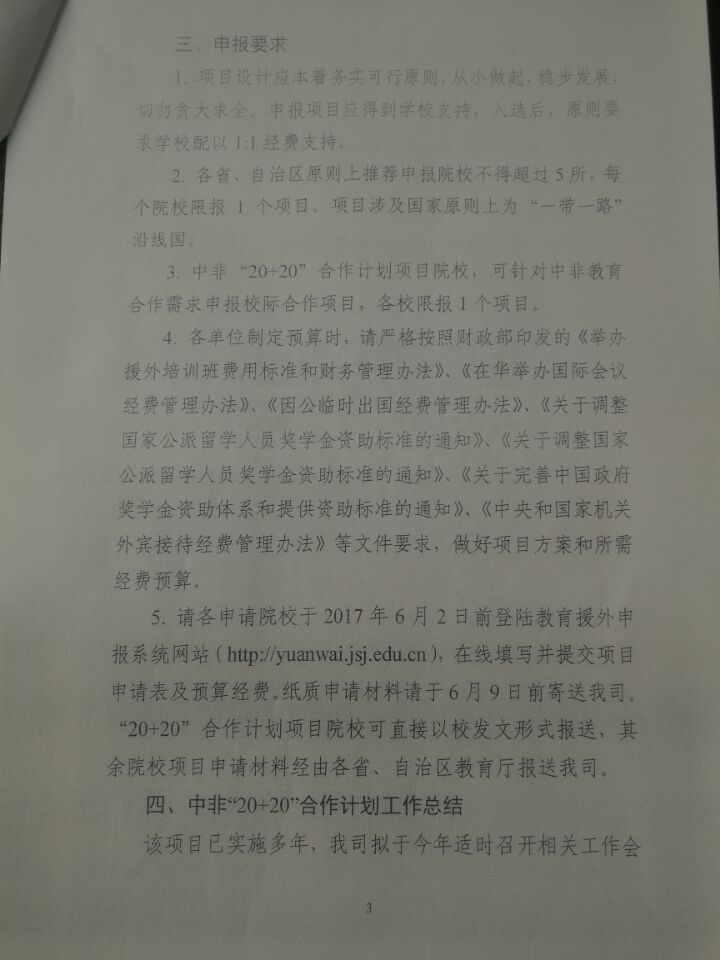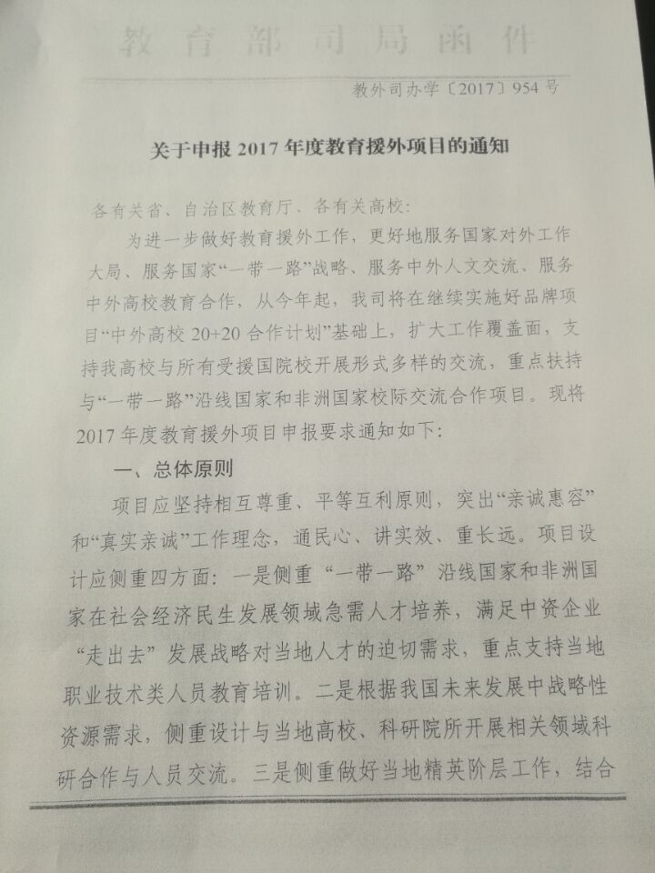 现转发教育部国际合作与交流司《关于申报2017年度教育援外项目的通知》(教外司办学[2017]954号)。有意向的单位,请根据文件要求,于2017年5月31日前,登录教育援外申报系统网站(http://yuanwai.jsj.edu.cn),在线填写并提交项目申请表及预算经费,纸质申请材料(一式3份)于2017年6月1日报送至学校科技处。